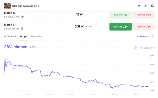 图表3:Polymarket博彩数据显示市场预期3月底停火的概率已经由78%下降至28%